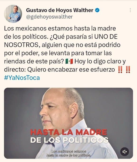 “Los mexicanos estamos hasta la madre de los políticos, sexenio tras sexenio, nos han demostrado que son unos incompetentes y que tienen otras prioridades más importantes que tú y que yo. ¿Qué pasaría si uno de nosotros se levanta para tomar las riendas de este país? Alguien que sienta lo mismo que nosotros. A mí me preocupa mi familia, mi trabajo y mi país. Tengo la misma sangre que tú, alguien que no está podrido del poder. Soy Gustavo de Hoyos, orgullosamente norteño y fronterizo, no vivo de la política, y así como en mis negocios y mi vida privada, me gusta ser claro y directo. Yo estoy listo y me apunto, yo quiero encabezar ese esfuerzo”, expresó.