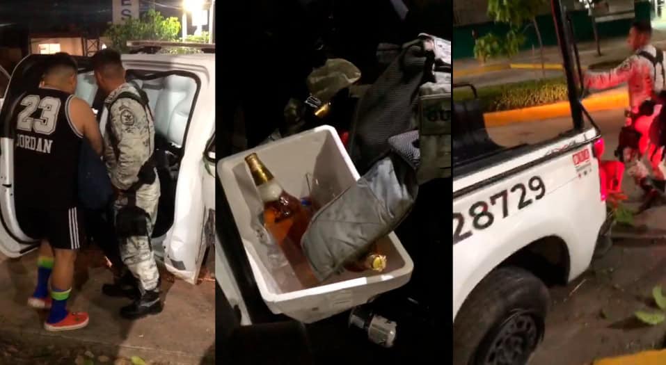 En uno de los videos se observa a un elemento de la Guardia Nacional tirado, presuntamente lesionado, mientras que los otros tres uniformados buscan esconder y retirar las botellas de la unidad oficial.