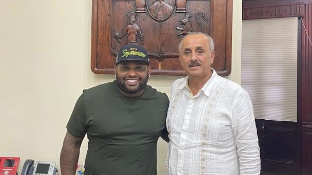 El gobernador, Carlos Manuel Merino Campos, recibió este viernes en Palacio de Gobierno a Pablo Sandoval, nuevo refuerzo de los Olmecas de Tabasco.
