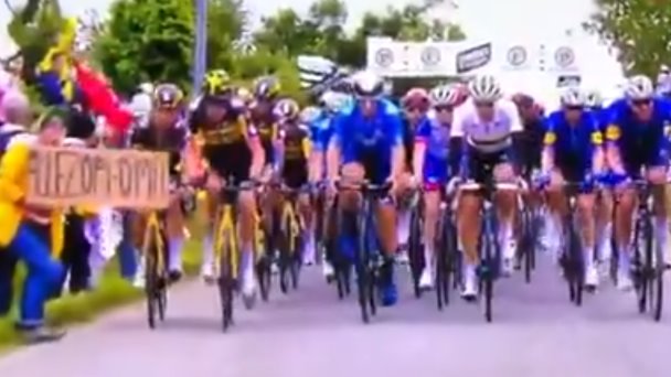 La mujer posaba con un cartel en el área de rodamiento donde se desplazaban los competidores, ocasionando un choque con el corredor Tony Martin, quien cayó al momento, y generó un “efecto dominó” afectando a decenas de ciclistas.