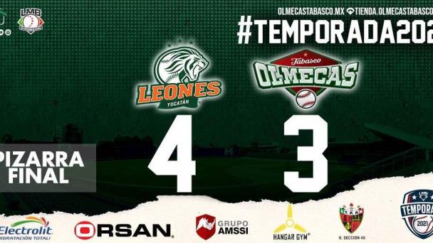 Los Olmecas de Tabasco dejaron la carrera del empate a 90 pies de la registradora, luego de que Edwin García se fue dominado como el out 27 con elevado al derecho para que de esta forma Josh Lueke (12) obtuviera un dramático rescate y preservara la victoria de 4-3 de los Leones de Yucatán, triunfo que otorga la serie a los melenudos, y que aún les coloca con la posibilidad de finalizar en segundo lugar del pelotón sureño.