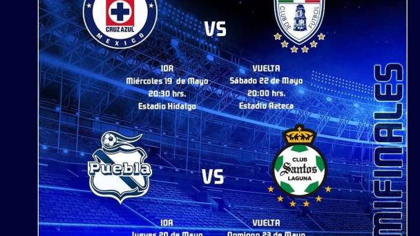 El primer duelo será el que protagonizarán el Cruz Azul y el Pachuca, que vencieron al Toluca y al América, respectivamente, y se enfrentarán este miércoles a las 20:30 horas en el Estadio Hidalgo; mientras que el de vuelta será el sábado 22 de mayo a las 20:00 horas, en el Estadio Azteca.
