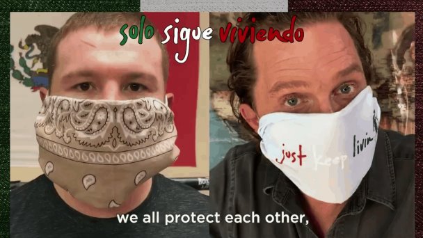 “- (McConaughey) Buenos días, tardes y noches. Si vas salir de casa, asegúrate de usar mascarilla. Tengo un amigo, un campeón que tiene un mensaje para ti. – (Canelo) Hola amigos, solo para recordarles que estamos en una gran batalla contra el coronavirus, hay que vencerlo juntos quedándote en casa lo más que puedas, y si tienes que salir, ponerte una máscara. Recuerda que hay que cuidar a nuestras familias y amigos, y vencer a este pinche coronavirus. – (McConaughey) Yo uso uno para cuidarte a ti. – (Canelo) Tú usas uno para protegerme a mí. – (Los dos) Cuando todos la usamos todos juntos nos cuidamos. Muchas gracias, y solo sigue viviendo”.