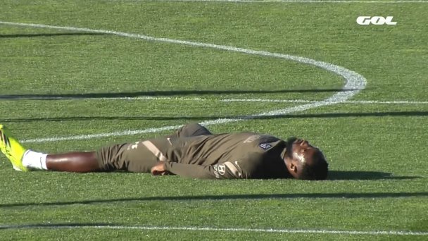 En un video publicado por el medio ibérico Goal, se observa al atacante realizar labores de estiramiento, tras lo cual, se desploma hacia atrás, moviendo únicamente la pierna izquierda.