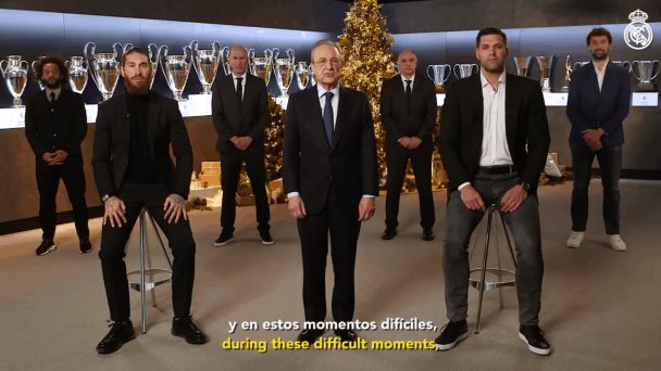 “- (Florentino) Desde el Real Madrid queremos enviaros, en estos días tan especiales y en estos momentos difíciles, un mensaje de cariño, solidaridad y esperanza. – (Zidane) Sabemos que son tiempos complicados, y debemos esta más unidos que nunca. – (Ramos) Todos juntos vamos a salir adelante como siempre lo hemos hecho”.