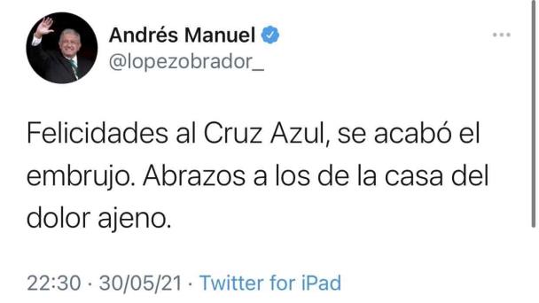 “Felicidades al Cruz Azul, se acabó el embrujo. Abrazos a los de la casa del dolor ajeno”, escribió en Twitter, refiriéndose también a Santos Laguna, el equipo subcampeón.