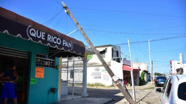 El choque entre dos vehículos en días recientes casi derrumba un poste de Telmex, el cual es sostenido únicamente por la marquesina de una casa en la Av. Ramón Mendoza en Tierra Colorada.