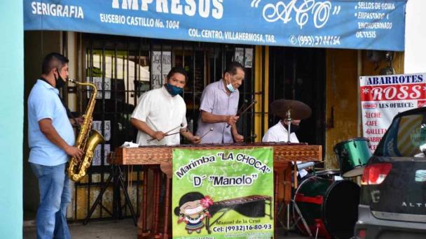 Para ambientar un poco el día y a la vez recaudar algún apoyo de las personas, miembros de la marimba 'La Choca' tocan su mejor repertorio en la banqueta de la calle Eusebio Castillo tres veces a la semana.