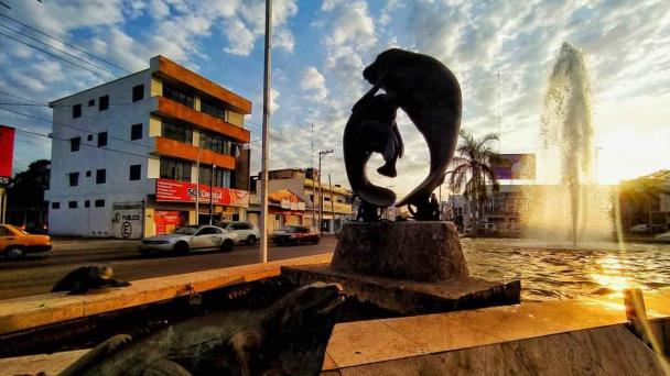 Un sol que se despide del día, acompañado de una imponente fuente del chorro con sus manatíes elevándose sobre el agua, y flanqueados por dos palmeras, se convierten en una bella postal ante la que ningún tabasqueño puede quedar indiferente.