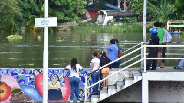 Curiosos se asoman a documentar el alto nivel de aguas del Grijalva
