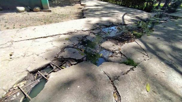 Enorme fuga de aguas negras recorre parte del parque Tomás Garrido