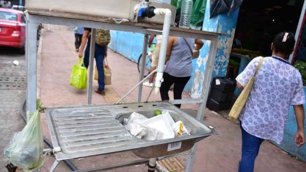 Lavamanos provisional es usado como bote de basura afuera de Tianguis Campesino
