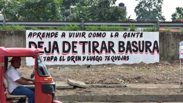 "Aprende a vivir como la gente. Deja de tirar basura", es parte de lo que se lee en una barda en la colonia La Manga I, donde vecinos están cansados de la basura que de todas partes llegan a arrojar a ese lugar, y que termina tapando el dren que pasa por la zona. La barda fue pintada días después que el Ayuntamiento de Centro limpiara la basura del lugar.