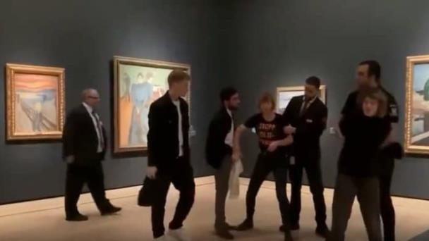 Un video del incidente mostró a los guardias del museo reteniendo a dos activistas, uno de los cuales gritaba: “¡Yo grito por la gente que muere!”. Otro gritó “¡Yo grito cuando los legisladores ignoran la ciencia!”.