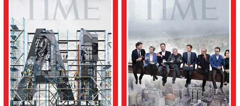 En las portadas se observa las siglas IA en construcción y a un grupo de empresarios sentados en una viga de acero, suspendida a gran altura sobre la ciudad de Nueva York mientras almuerzan, lo que hace referencia a la fotografía "Lunch atop a Skyscraper" (Almuerzo en la cima de un rascacielos), de 1932.