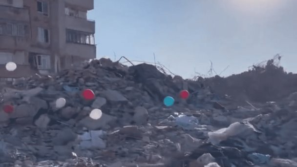 En memoria de los niños que perdieron la vida en los terremotos de Turquía, fueron colocados globos sobre los escombros de edificios que colapsaron.