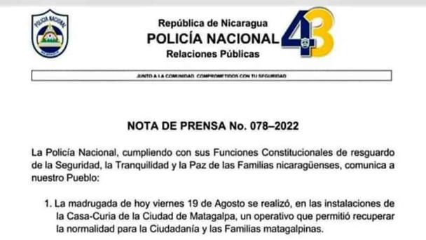 Finalmente, apuntó que en la Curia Diocesana de Matagalpa quedó en carácter de "Autoridad Eclesial", y sin ninguna restricción policial o de movilidad, Monseñor Óscar Escoto, quien se desempeñaba como Vicario de la Diócesis.