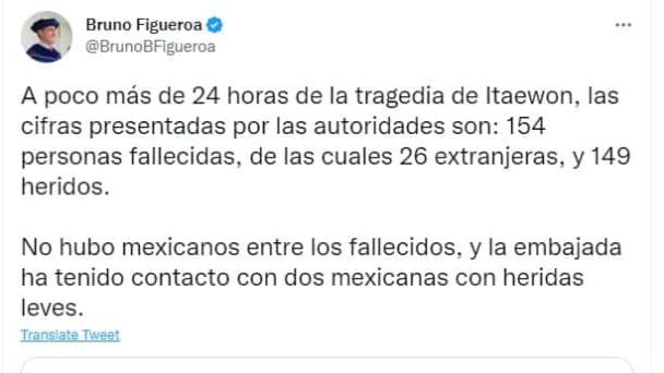 El Embajador de México en Corea del Sur, Bruno Figueroa, informó que se tiene registro de dos connacionales con heridas leves.