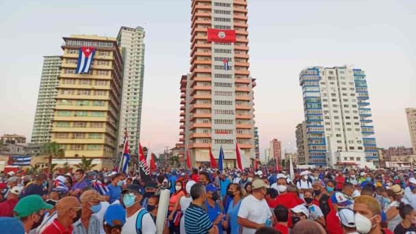 La concentración se realizó en la explanada de La Piragua, en el malecón habanero, en donde más de 100 mil personas también acudieron para exigir el levantamiento del bloqueo económico, comercial y financiero impuesto por Estados Unidos desde hace casi seis décadas, considerado el principal obstáculo para el desarrollo de la isla y recrudecido durante la pandemia del coronavirus.