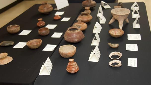 Destacan piezas como un vaso con soporte en forma de pedestal, elaborado en barro con técnicas de modelado y esgrafiado, perteneciente a las culturas de la Costa del Golfo, del periodo Clásico mesoamericano de los años 100 a 900 después de Cristo.