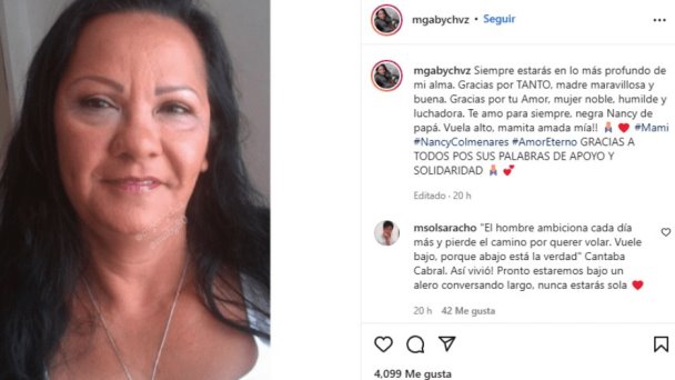 María Gabriela Chávez, hija del expresidente de Venezuela, Hugo Chávez, informó que su señora madre, Nancy Colmenares, primera esposa del comandante, falleció el sábado 23 de abril.