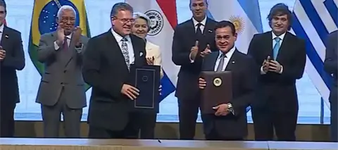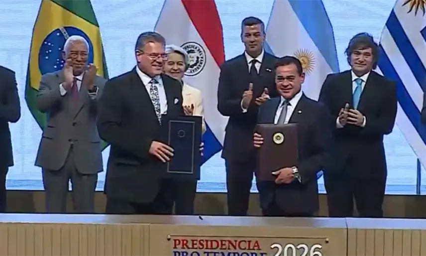 La ceremonia -que se realizó en el Gran Teatro del Banco Central de Paraguay- contó con la participación del bloque europeo liderado por Ursula Von der Leyen, así como de las naciones fundadoras del Mercosur, Brasil, Argentina, Paraguay y Uruguay.