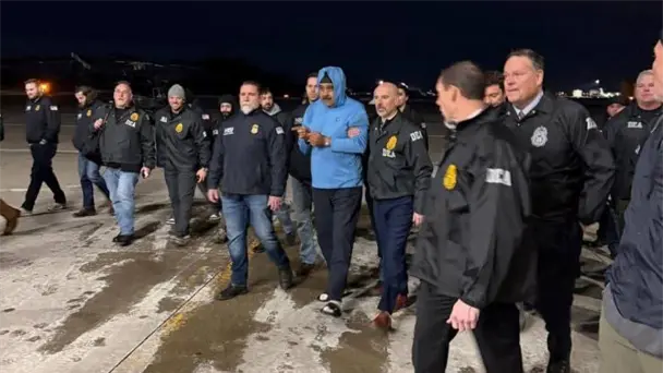 En el clip se observa al mandatario venezolano esposado, portando una especie de gorro y vestimenta oscura, mientras es custodiado por agentes de la DEA.