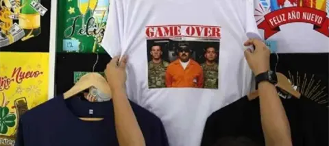 Una de las prendas muestra la fotografía de Maduro Moros con los ojos tapados, vistiendo ropa deportiva gris y custodiado por militares estadounidenses, pero también hay otras creadas con inteligencia artificial y con la leyenda: "Venezuela libre".
