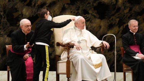 Un niño con discapacidad se convirtió en el protagonista de la audiencia celebrada por el Papa Francisco, ya que, tras separarse de su madre, subió al estrado para pedirle al Santo Padre su solideo.