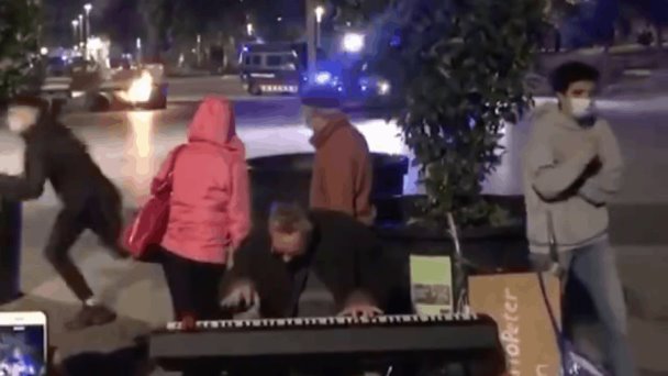 La grabación se ha difundido en la cuenta de Instagram ‘PianolitoPeter’, y se puede apreciar a la persona interpretar la melodía mientras algunas patrullas sobre la calle tratan de controlar a varios sujetos que les lanzan piedras.