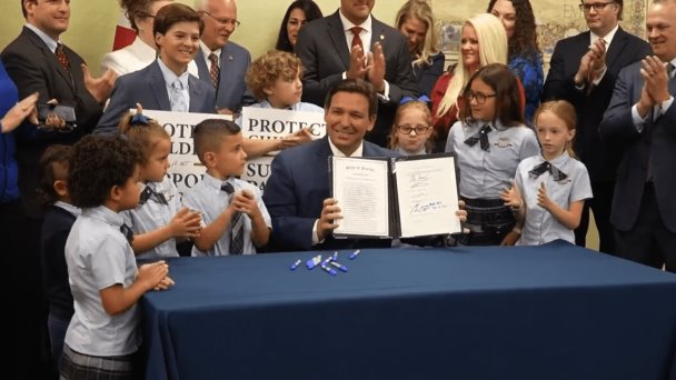 Rodeado de alumnos, este lunes el gobernador de Florida, Ron DeSantis, promulgó en un centro escolar de Spring Hill, al norte de Tampa, un proyecto de ley que prohíbe la enseñanza sobre orientación sexual e identidad de género en las escuelas, a partir del 1 de julio.