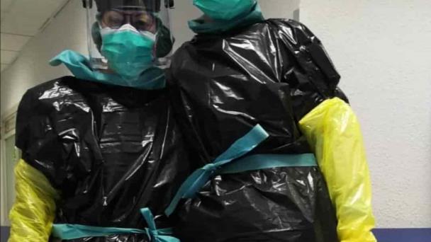 En España trabajadores de sanidad han evidenciado la falta de insumos y aditamentos médicos para hacer frente a la pandemia por coronavirus que sigue cobrando vidas; y es que con bolsas de basura se protegen del coronavirus.