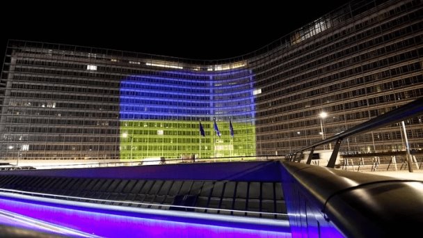 En tanto, el edificio de la Comisión Europea también fue iluminado con los colores de la bandera ucraniana durante la cumbre en la que se decidieron duras sanciones para Rusia.