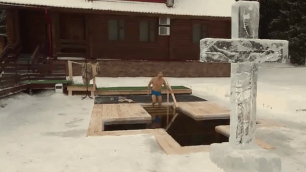 De acuerdo a “La Prensa”, tras quitarse un grueso abrigo y las botas, y quedarse en traje de baño azul, Vladimir Putin entró en una alberca frente a una gran cruz translúcida, aparentemente tallada en el hielo y rodeada de nieve.