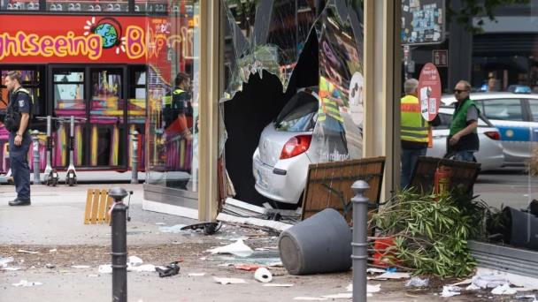 Los hechos ocurrieron la mañana de este miércoles, cuando el conductor subió la banqueta y arrolló a un grupo de personas que estaban en las inmediaciones de la iglesia Kaiser Wilhelm. Luego estrelló su vehículo contra una tienda de perfumes.