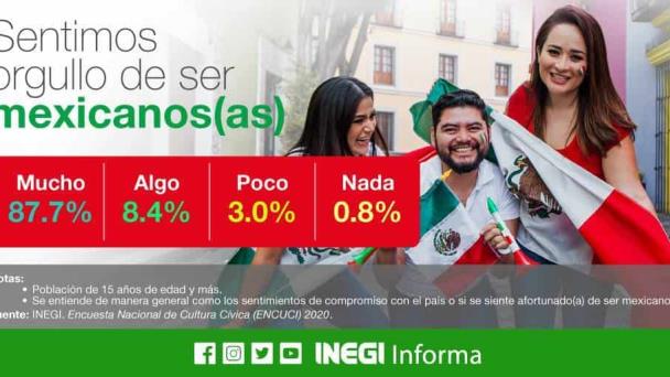 El 87.7 por ciento de la población mayor de 15 de años dijo sentirse orgullosa de ser mexicana, indicó el Instituto Nacional de Estadística y Geografía (Inegi) al presentar la Encuesta Nacional de Cultura Cívica (Encuci) 2020.