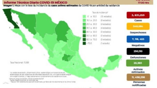 La dependencia también detalló que hay 19 mil 155 casos activos en todo el país y 548 mil 584 casos sospechosos.
