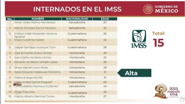 Por otro lado, informó que tiene el registro de que de las 28 personas heridas: cinco son originarios de El Salvador, 10 de Guatemala, ocho de Honduras y cinco de Venezuela. De ellas, 27 permanecen hospitalizadas y una fue dada de alta.
