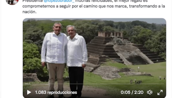 A través de sus redes sociales, compartió dos videos, uno con fotografías del caminar político de López Obrador y otro, donde se le ve junto al tabasqueño, en la zona arqueológica de Comalcalco.