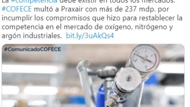 Cofece multa a Praxair con 237 mdp, por prácticas monopólicas en venta de oxígeno