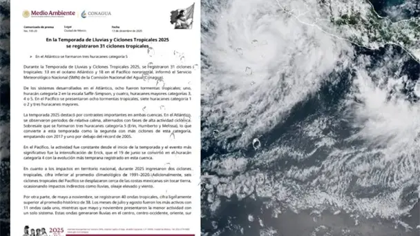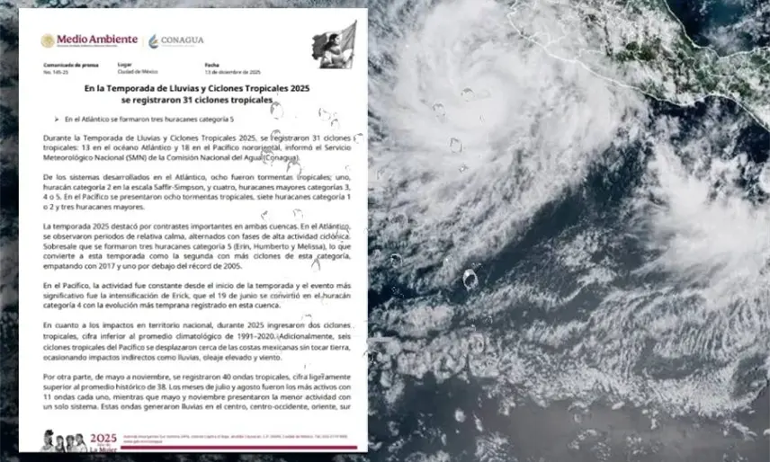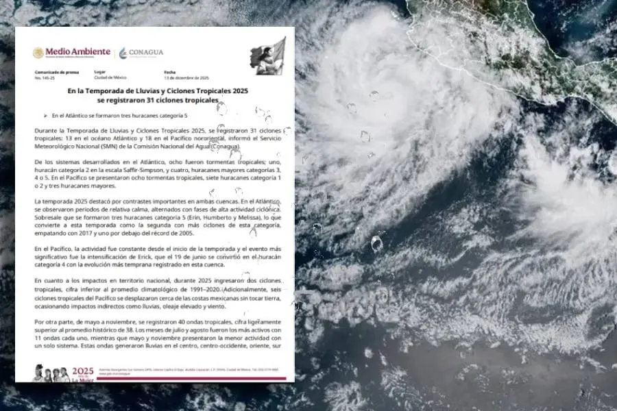 La Comisión Nacional del Agua (Conagua) informó que la temporada de huracanes 2025 concluyó con un registro de 31 ciclones tropicales.