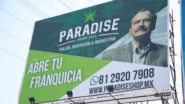 El ex presidente Vicente Fox Quesada apareció en la ciudad de Monterrey, Nuevo León en anuncios espectaculares de la empresa Paradise, que promociona productos legales derivados de la marihuana.