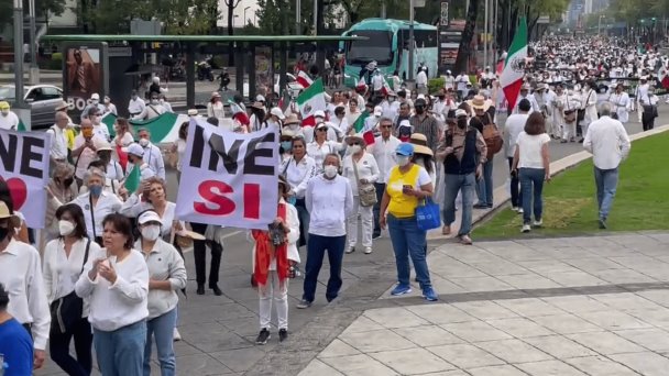 Vestidos de blanco, los inconformes portaron banderas de México y lonas con frases como “No a la militarización” e “INE Sí”, en referencia al Instituto Nacional Electoral (INE), cuya desaparición sería, según opositores al presidente Andrés Manuel López Obrador, propuesta en su iniciativa de reforma electoral.
