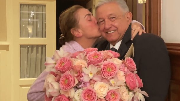 En otro momento de la grabación, se ve al mandatario federal entregándole un ramo de flores de color rosa