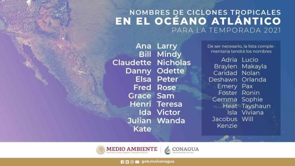 De esta manera, indicó que los ciclones que se presenten este año, llevarán los nombres de Ana, Bill, Claudette, Dany, Elsa, Fred, Grace, Henri, Ida, Julian, Kate, Larry, Mindy, Nicholas, Odette, Peter, Rose, Sam, Teresa, Víctor y Wanda.