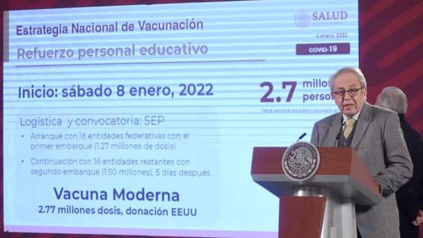 “Es el refuerzo al personal educativo, que se inicia el sábado 8 de enero y que cubre el estimativo de 2.7 millones de personas y se va a hacer de acuerdo a la logística y convocatoria sumada a la de Salud, por la Secretaría de Educación Pública y se arrancará en 16 entidades federativas con el primer embarque, que es de 1.27 millones, y el segundo, que viene cinco días después, de la vacuna Moderna, en 16 entidades restantes en este embarque, para una total aplicación de la vacuna Moderna”, afirmó.