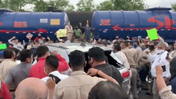 En segundos, Samuel García fue rodeado por los trabajadores, quienes comenzaron a insultarlo y a golpear el vehículo en repetidas ocasiones, lo que ocasionó que se rompieran los cristales, por lo que tuvo que retirarse del lugar en medio de la turba.