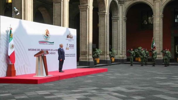 El presidente Andrés Manuel López Obrador reiteró durante su primer informe trimestral de labores desde Palacio Nacional que pese a la contingencia sanitaria por el Covid-19, el Tren Maya, el aeropuerto Felipe Ángeles de Santa Lucía y la refinería de Dos Bocas continuarán su construcción.