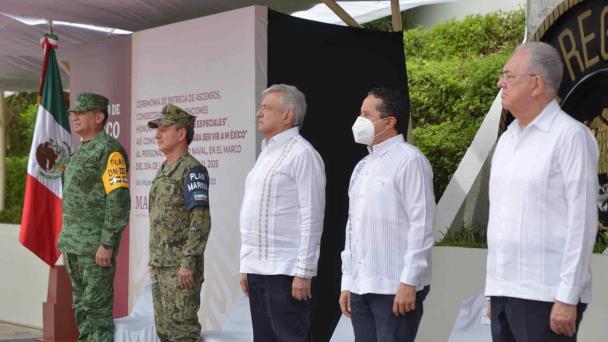 En el evento que se llevó a cabo en Quintana Roo, el mandatario federal estuvo acompañado por el titular de la SEMAR, Rafael Ojeda Durán; el secretario de la Defensa Nacional, Luis Cresencio Sandoval; el secretario de Comunicaciones y Transportes, Javier Jiménez Espriú y el gobernador del estado, Carlos Manuel Joaquín González.