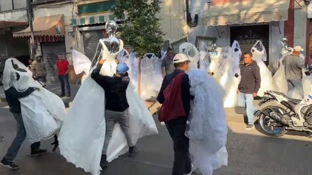 Videos muestran cómo alrededor de 50 trabajadores comenzaron a desalojar los aproximadamente seis locales, quienes colocaban los vestidos de novia sobre las citadas vialidades.